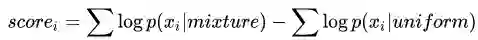 其中mixture是gaussian mixture,可以通过EM算法得到。也就是,如果簇的形状越接近高斯分布(也就是越集中),得分越高;反之越分散越接近均匀分布,得分越低: