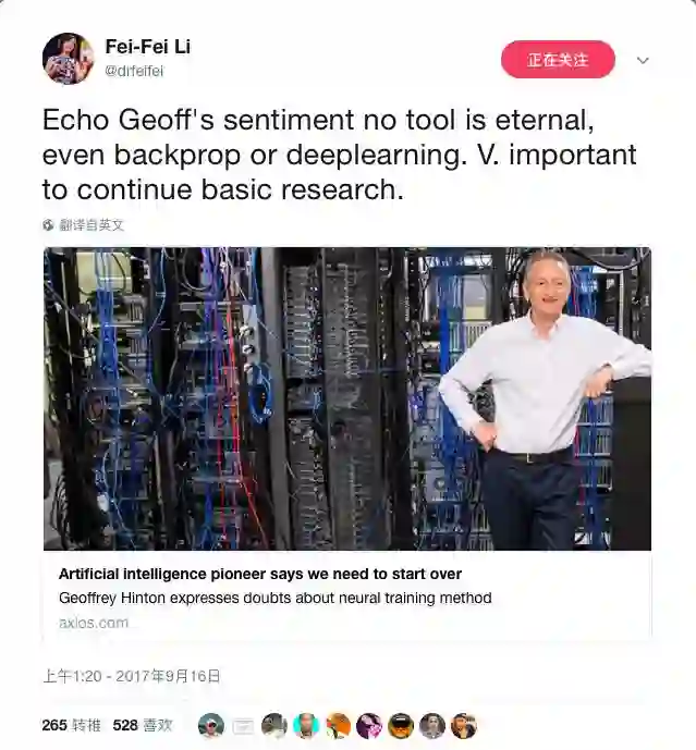 Hinton近几年以 “卷积神经网络有什么问题?” 为主题做了多场报道,提出了他的Capsule计划。Hinton似乎毫不掩饰要推翻自己盼了30多年时间才建立起来的深度学习帝国的想法。他的这种精神也获得了同行李飞飞(ImageNet创始者)等人肯定。