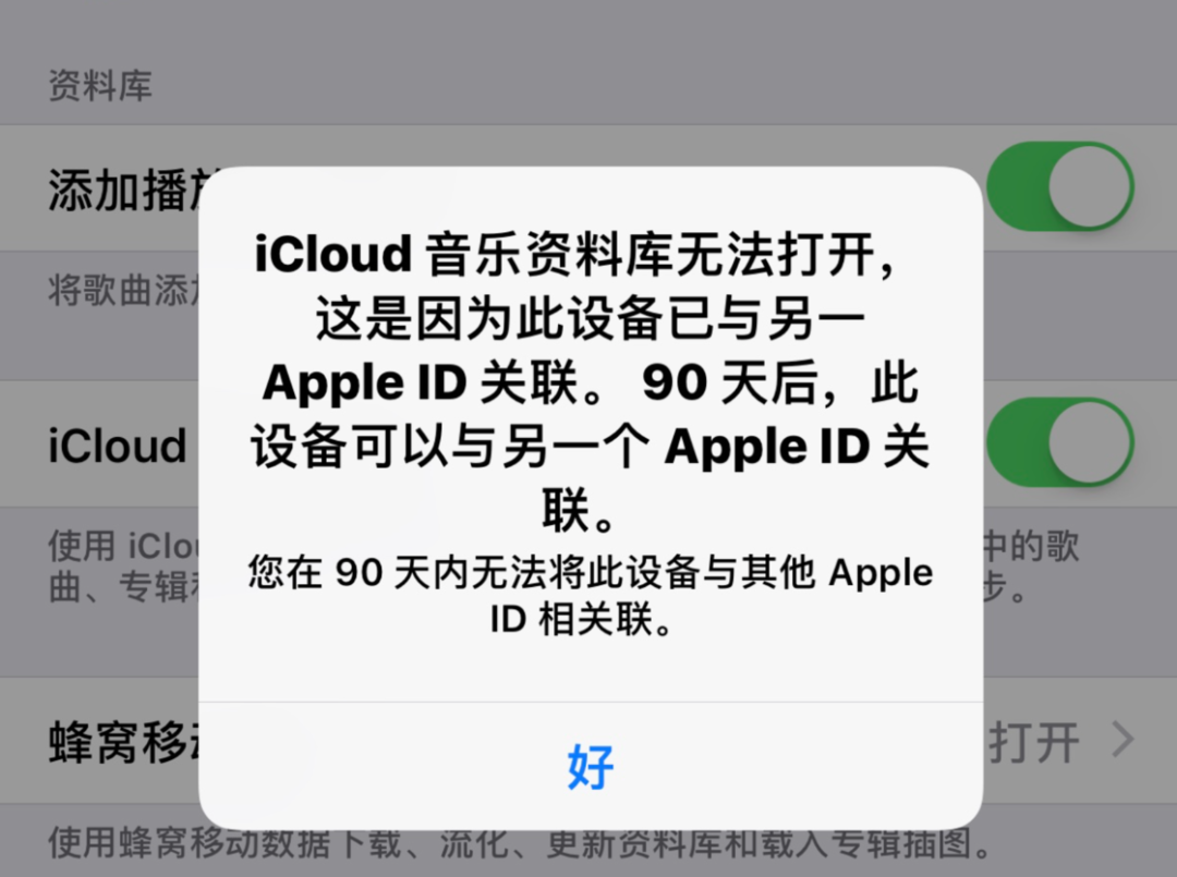 绑定后,若再使用其他 Apple ID 开启 Apple 媒体内容下载功能时,系统会提示此设备已与其他 Apple ID 绑定,并告知还剩余多少时间。(若不小心错误地触发绑定,可联系 Apple 官方客服,有一定几率可以提前解绑。)