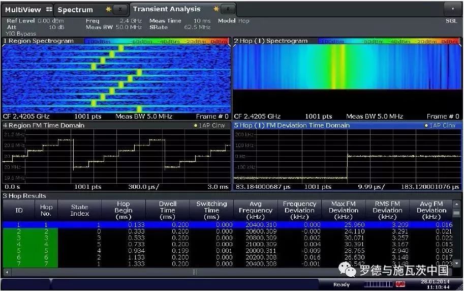 无人机地空通信链路所处的频段比较拥挤,为了确保在恶劣环境下不失控,通信技术的可靠性至关重要。抗干扰是衡量一款遥控器好坏的第一指标,而基于跳频体制的数据链通信即是一种用于无人机抗干扰的方案,相比定频通信方式,具有抗干扰性能好,抗衰落、多径效应能力强。R&S的FSW具有专门的瞬态分析软件完成干扰信号的定位和分析。