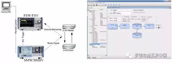 系统中的信号源SMW200A/SMBV100A配置K350选件,用于DFS测试的雷达信号产生,频谱仪:FSW/FSV的分辨率带宽可以大于3MHz,用于监测被测件对雷达信号的响应。DFS TOOL软件用于控制频谱仪监测被测件在雷达信号作用下的响应时间等指标。