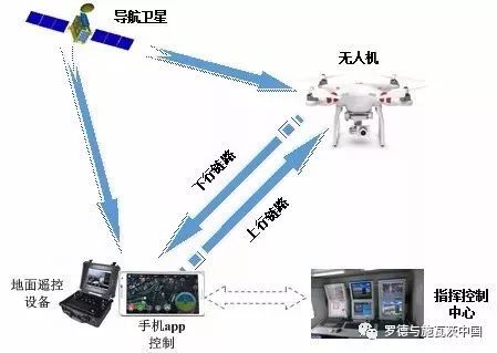 无人机的工作,一般都是通过地面遥控设备进行控制,也有通过手机App方式控制,其中,手机App控制的模式,无法单独发送遥控指令,必须协同数传、图传的方式发送,遥控设备则可单独发送遥控指令,其工作方式如图1所示。