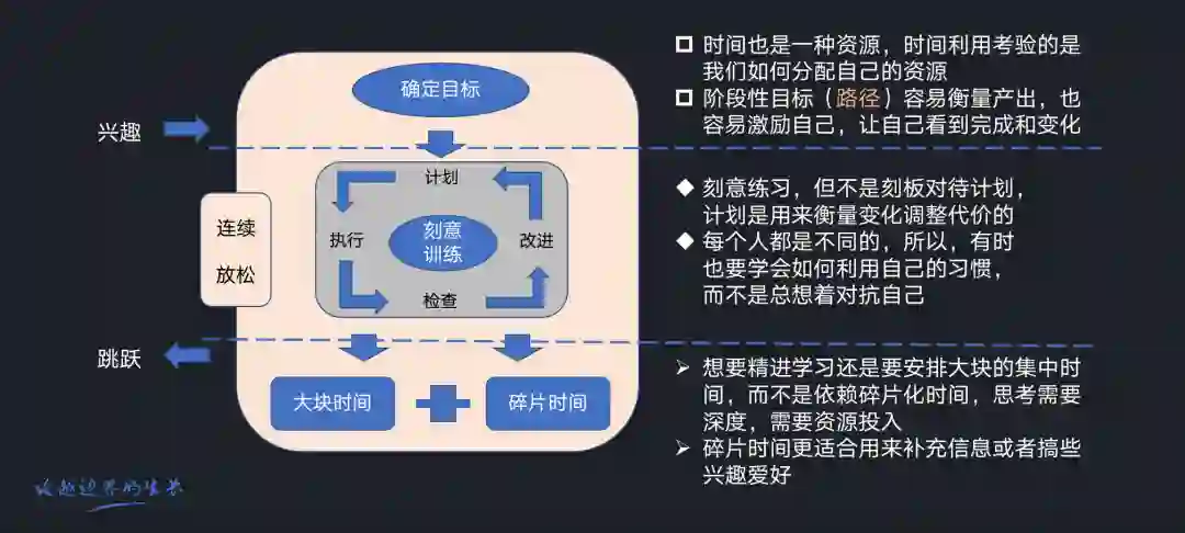 一定要有这样突破性的过程,过了这个阶段之后,碎片化时间的学习效率就会明显提升,因为你已经有了知识体系,碎片只是用来做填补,这种方式结合起来,你才能有真正的突破。当然这是我个人的学习习惯,大家可以根据自己的习惯去学习,不要刻意对抗自己以往的学习习惯,顺着自己的路径走才会是最有效的学习方法。