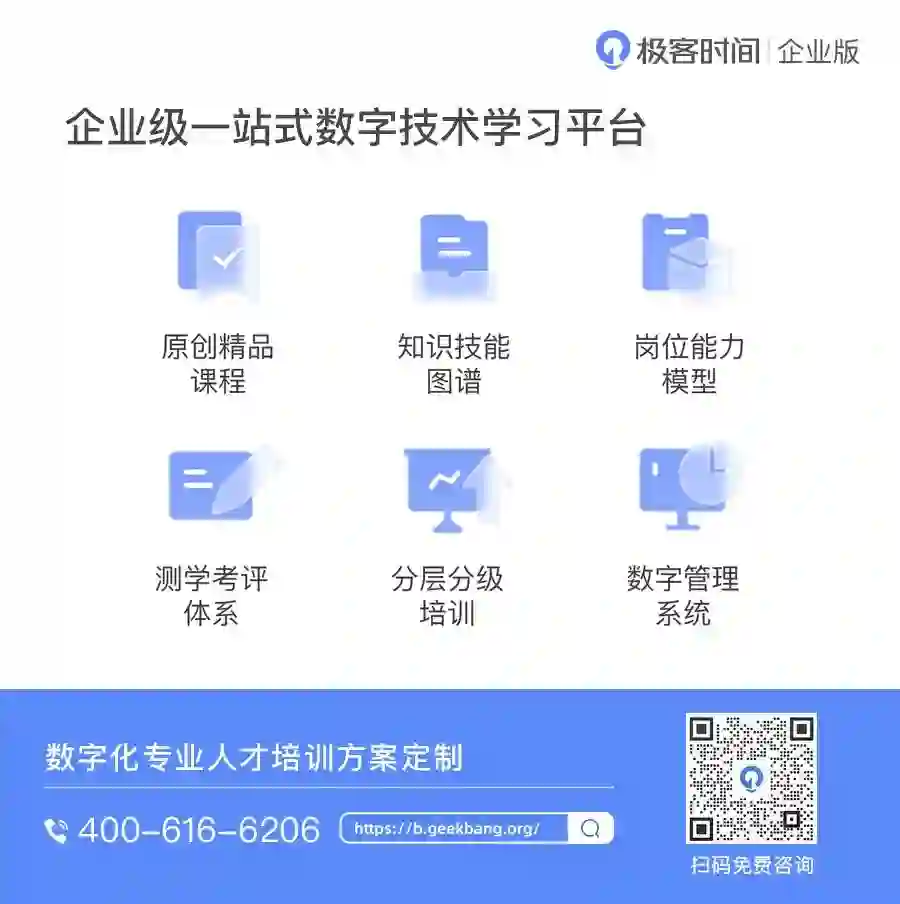极客时间企业版由极客邦科技倾力打造,是企业级一站式数字技能学习 KaaS 平台。通过好内容、好平台、好服务的“三好体验”,助力企业打造行业领先的数字人才团队,驱动企业的数字化转型与高质量发展。