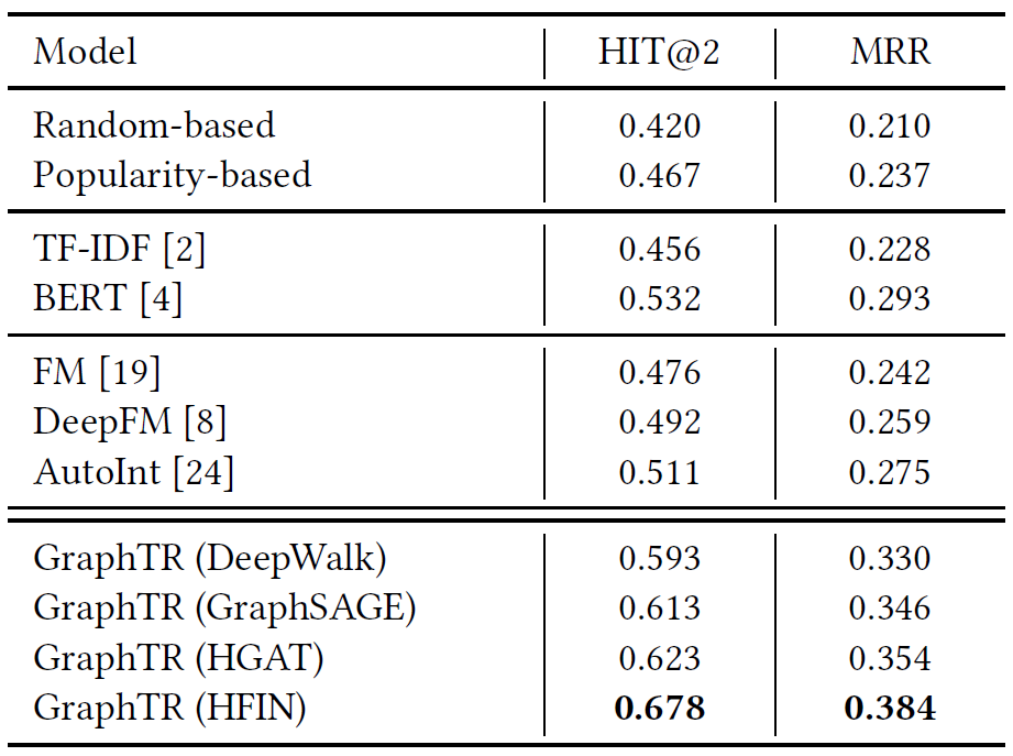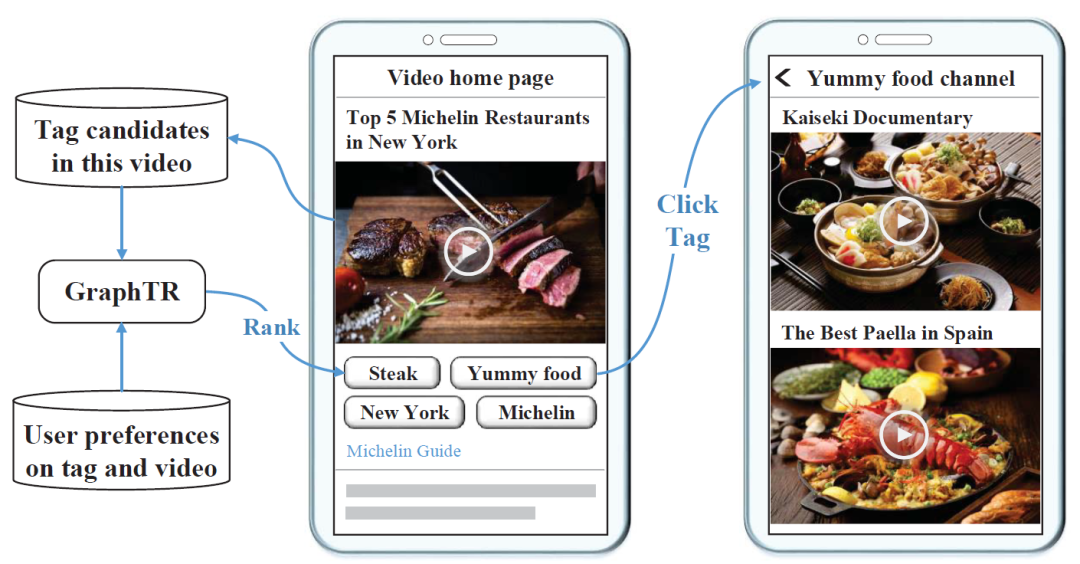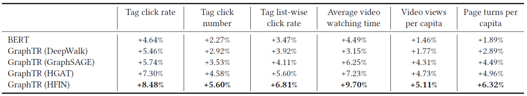 (3)线上标签排序模块,使用学到的节点表示进行线上标签排序。GraphTR成功地从多种异质交互信息(特别是用户丰富的对视频的行为)中学习到了用户对于标签的偏好,从而极大地缓解了用户标签行为稀疏带来的问题,构建用户对视频的偏好和对标签的偏好之间的桥梁。