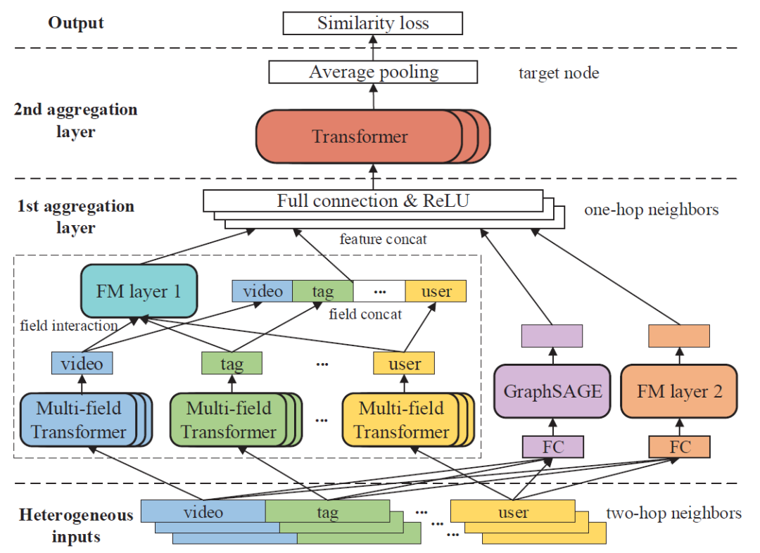 2、我们提出了一种新的图神经网络模型,融合Transformer,GraphSAGE和FM特征抽取器得到节点表示。我们还提出了一个基于邻居相似度的loss,将用户的多样偏好学到节点表示中。