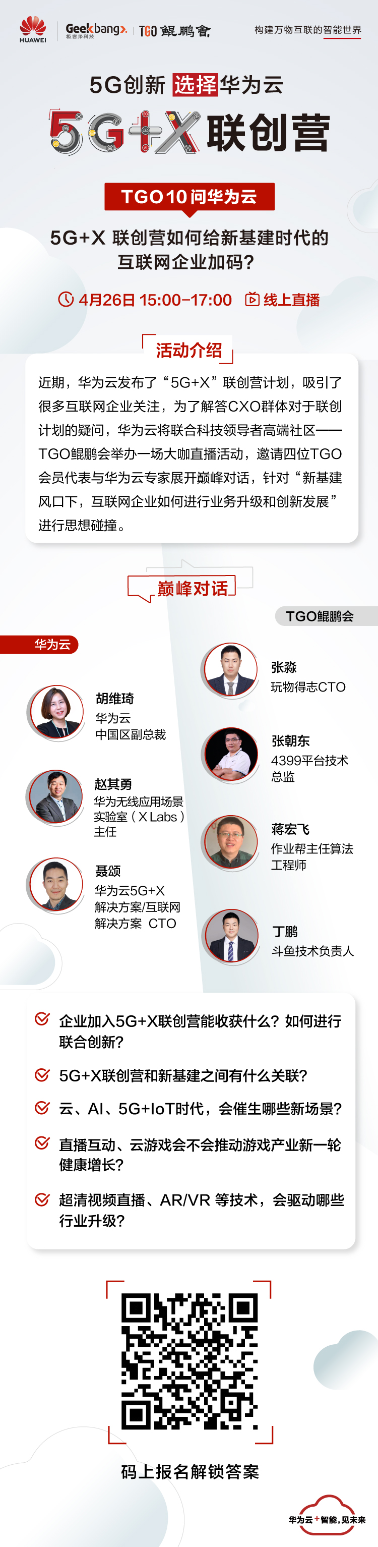 为了解答 CXO 群体对于联创计划的疑问,让大家更好地了解如何进行联创,同时也为了了解不同行业 CXO 关注哪些层面的合作,华为云“5G+X”联创营将在 4 月 26 日举办一场大咖直播活动,届时将会邀请到汇聚全球科技领导者的高端社区——TGO 鲲鹏会 4 位会员提问华为云专家,针对在线教育、音视频、智慧电商、游戏等领域的痛点和发展难点,寻找借力华为云的答案。