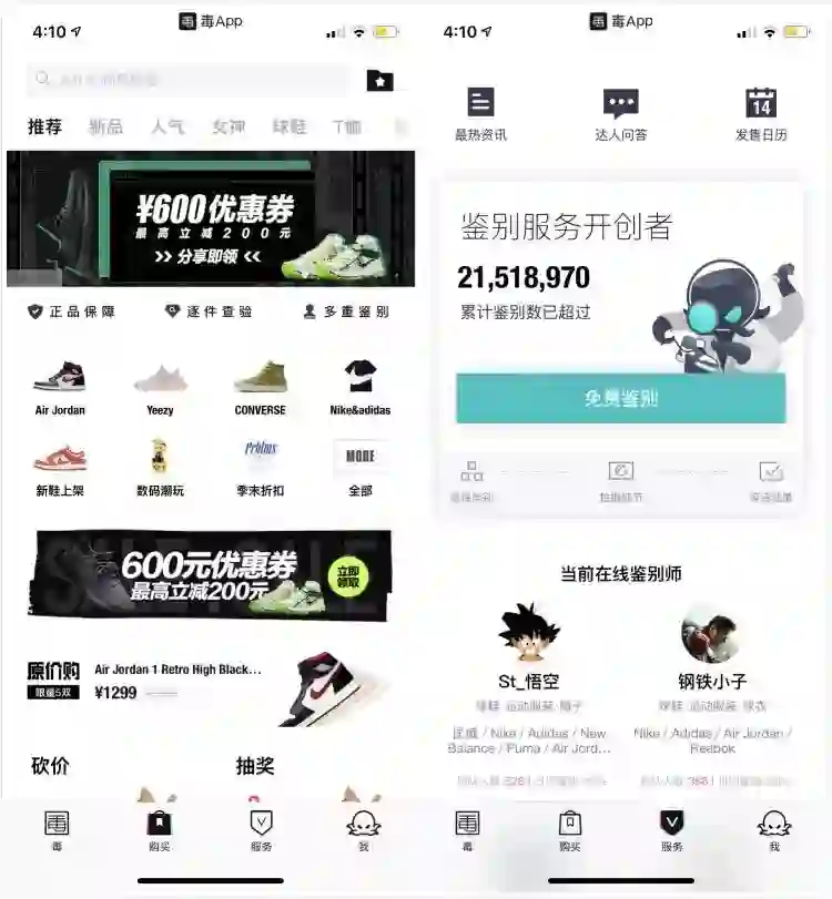 毒 App的交易在流程方面,球鞋需邮寄到操作中心,在中心统一鉴定。先质检查瑕疵,再到真假鉴定。 昭阳表示,现在有些假鞋仿得很真,团队甚至会先切开它,来研究它的制造工艺,完成研究具备该商品鉴定能力后,商品页面才会在平台上架。