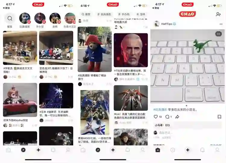 CHAO 的产品展示逻辑跟小红书很相似,最主要的内容都是用图片和用户分享。话题涉及咖啡、球鞋、衣物等生活内容,以及电脑、单反器材等。