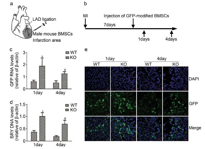 外泌体是细胞外囊泡(EV)的亚类,其来源于细胞内的多泡体中的内部囊泡,并且它们的大小通常在40至200nm范围内。当多泡体与质膜融合时,外泌体组成性地释放到细胞外环境中。 Rab蛋白,一种GTP酶家族,在功能上参与细胞内膜运输的不同步骤,包括内吞和分泌过程,以及外泌体产生或分泌。敲低Rab27b后多泡体会重新分布至核周区域,而晚期胞内体和溶酶体区域在Rab27a基因抑制细胞中积累并扩大。这表明Rab27a是多泡体与质膜对接和融合所必需的,并且在外泌体分泌中也很重要。为了探索心脏外泌体在体内移植的BMSCs存活中的作用,研究人员构建了Rab27a KO的小鼠模型,将GFP标记的BMSC植入Rab27a KO雌性小鼠中与梗死心肌相邻的存活心肌中。通过Y染色体Sry DNA和GFP mRNA的表达以及通过检测GFP荧光信号强度来评估移植细胞的存活情况。在该研究中,研究人员通过体外和体内实验确定了心肌梗死中的心脏外泌体对移植的BMSC的存活的影响。