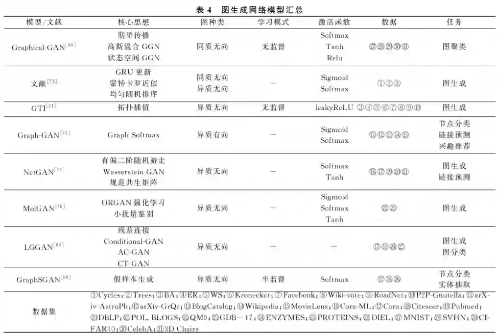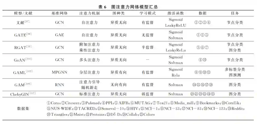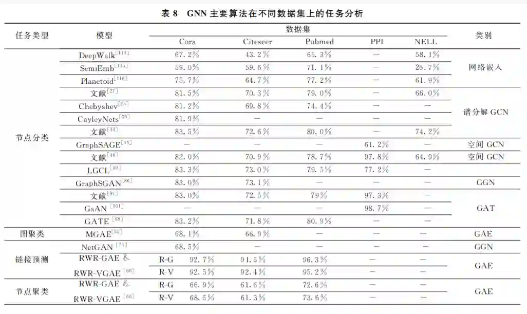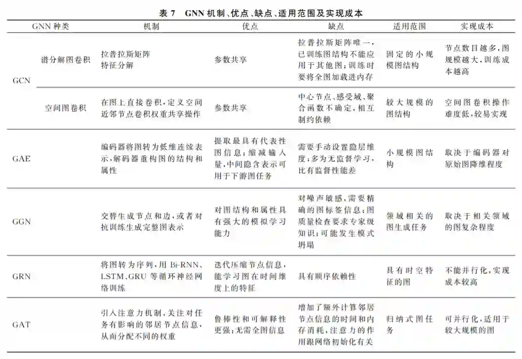 通过前文的归纳和分析, 从总体上看, 图神经网络可以分为五类: 图卷积网络、图自编码器、图生成网络、图循环网络和图注意力网络.每种图神经网络 都有自己对图结构数据处理的一套算法和体系,其 中的原理和适用的范围也有一定差别.当然它们之 间不是相互孤立和排斥的,例如文献[59,65]的图自 编码器中包含图卷积层,文献[91,95]的图循环网络 为了图序列学习更有效,也会加入注意力模块.而图 注意力网络也大多以其他图神经网络框架为基础, 构建合适的节点、边以及图注意力网络层.因此在实 际操作当中,需要根据图的分布和特征信息,以及任 务的实际需求,选择合适的图神经网络,来更加有效 地学习图结构数据. 表7是 GNN 机制、优点、缺点、 适用范围及实现成本汇总表。
