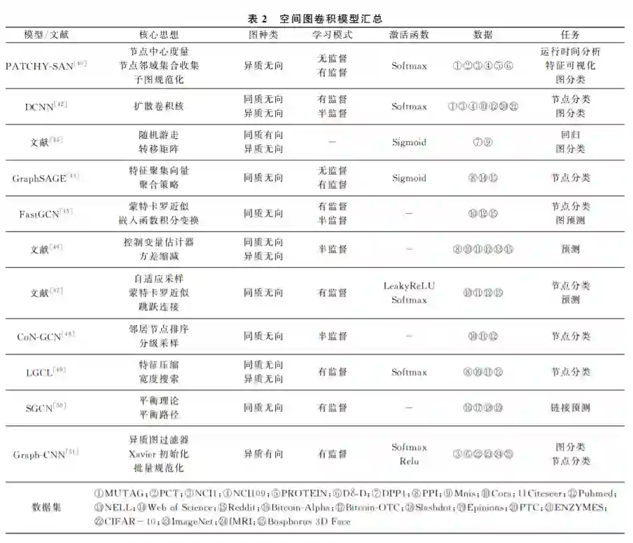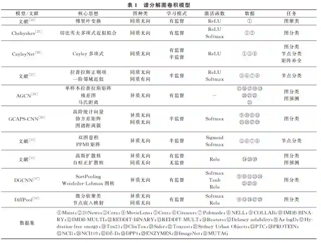 图 卷 积 网 络 (GraphConvolutionalNetwork, GCN)进行卷积操作主要有两种方法:一种是基于 谱分解,即谱分解图卷积.另一种是基于节点空间变 换,即空间图卷积.Bruna等人[10]第一次将卷积神 经网路泛化到图数据上,提出两种并列的图卷积模 型———谱分解图卷积和空间图卷积.Bruna等人对 比分析了一般图结构数据和网格数据共有的特点和 不同之处,综合运用了空间图卷积和谱分解处理图 像聚类问题.下面本文对谱分解图卷积和空间图卷 积进行详细的梳理和介绍。
