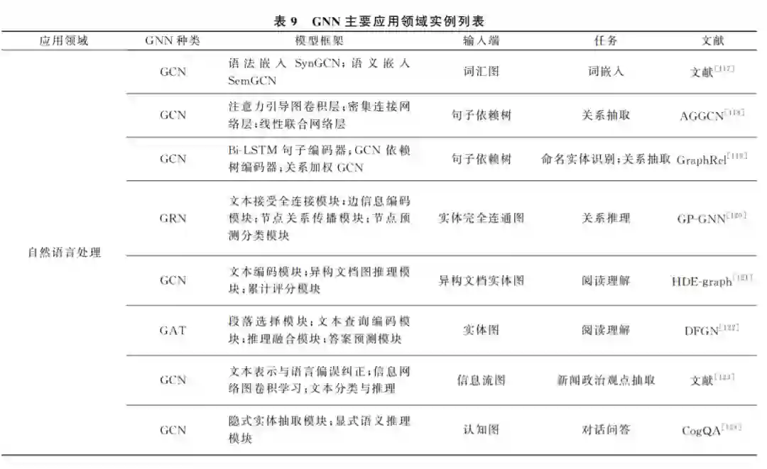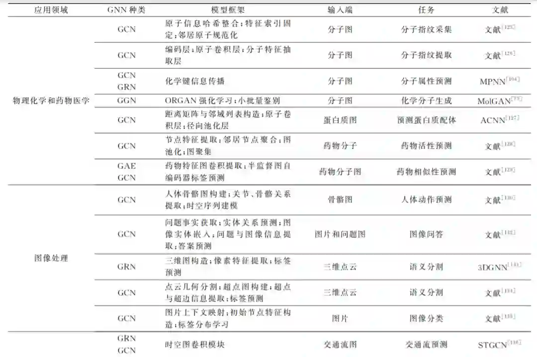 由于 GNN 能较好地学习图结构数据的特征, 因此在许多图相关的领域有着广泛的应用.若按照 应用中图的层次结构划分,则大体可以分为节点、边 和图层面.在节点层面,常见的有节点分类、节点聚 合、节点表示学习.在边层面,则有边分类、边聚类以 及链接预测.在图层面,图分类、图生成、子图划分、 图相似度分析等应用较为广泛.按照图的种类划分, 可以分为引文网络、社交网络、交通网络、图像、化合 物分子结构、蛋白质网络等.按照应用领域划分,可 以分为自然语言处理、图像处理、轨迹预测、物理化 学和 药 物 医 学 等.为 了 方 便 说 明 和 阐 述, 本 文 从 GNN 的主要应用领域这一角度出发,对近年来出现 的 GNN 应用实例进行分类归纳。