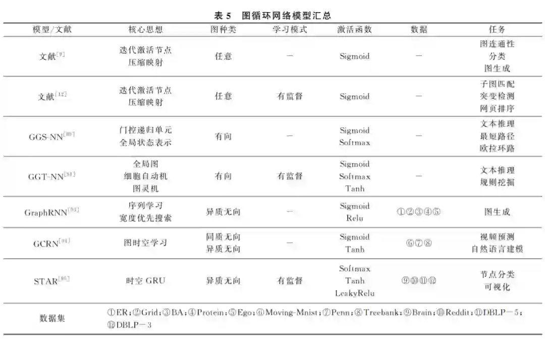图循环网络(GraphRecurrentNetwork,GRN) 是最早出现的一种 GNN 模型.相较于其他的 GNN 算法,GRN 通常将图数据转换为序列,在训练的过 程中序列会不断地递归演进和变化.GRN 模型一般 使用 双 向 循 环 神 经 网 络 (BidirectionalRNN,BiRNN)和长短期记忆网络(LongShort-Term MemoryNetwork,LSTM)作为网络架构.