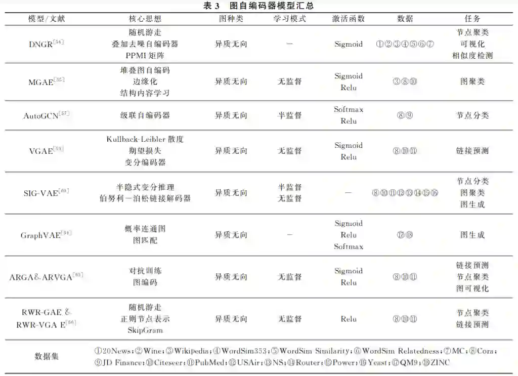 在 深 度 学 习 领 域,自 编 码 器 (Auto-encoder, AE)是一类将输入信息进行表征学习的人工神经网 络.自编码器一般包含编码器和解码器两个部分,基 于自编码器的 GNN 被称为图自编码器(GraphAuto-encoder,GAE),可以半监督或者无监督地学习 图节点信息.如图3所示