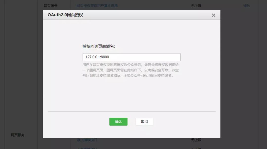 登陆测试号后可以查看到自己的appId和appsecret信息,将体验接口权限表里的网页服务的网页授权获取用户基本信息修改为127.0.0.1:8800,该地址就是用户确认授权后回调的地址即我们应用的后台处理地址,如下图
