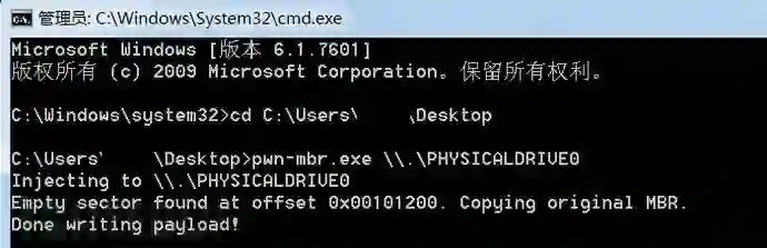 需要注意的是,笔者在调试程序时发现payload在写入时总是失败,提示参数错误,后来发现在对硬盘读写时,必须是512字节的整数倍才行,所以需要对源程序进行修改,将payload补齐到512字节后写入MBR扇区。
