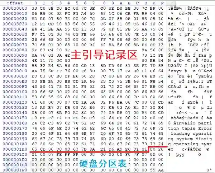 MBR(Main Boot Record 主引导记录区)位于整个硬盘的0磁道0柱面1扇区。MBR只占用该扇区的前446个字节,另外的64个字节属于DPT(Disk Partition Table硬盘分区表),最后两个字节“55,AA”是分区的结束标志,这两部分构成了硬盘的主引导扇区。