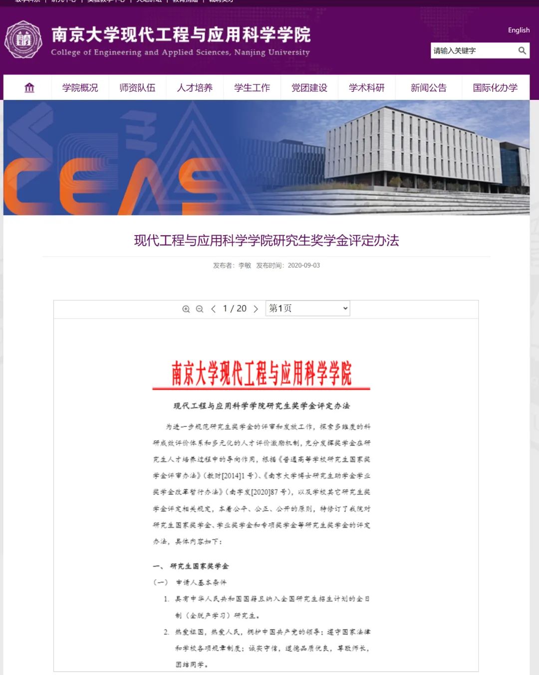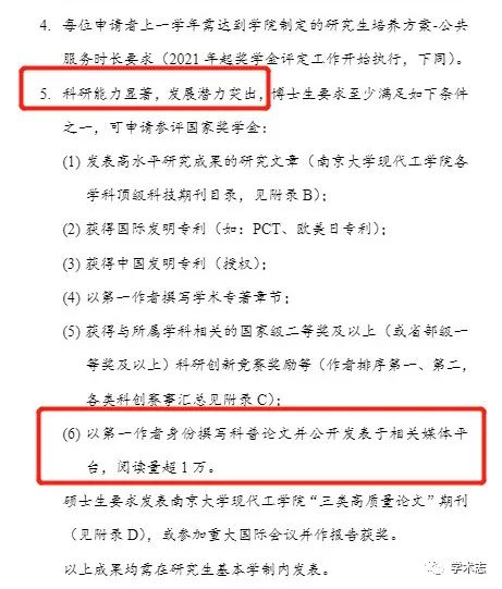 近日,南京大学现代工程与应用科学学院发布《研究生奖学金评定办法》。很多人注意到,《办法》最后一条提到博士生“以第一作者身份撰写科普论文并公开发表于相关媒体平台,且阅读量超1万”,就可以申请参评国家奖学金。