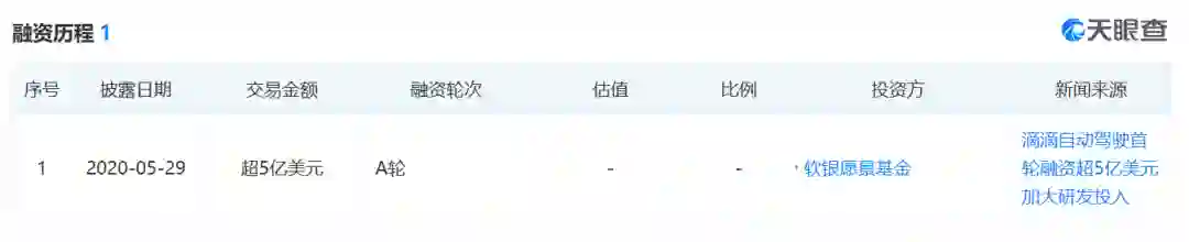 其中的滴滴,虽然从2016年就开始组建自动驾驶研发团队,次年在美国加州设立首家海外AI实验室,但其实前些年的动静并不大。直到去年,滴滴开始加强布局,8月份将自动驾驶部门升级为独立公司沃芽科技,天眼查显示,今年5月底获得软银超过5亿美元融资,成为国内这一领域的最大单笔融资。