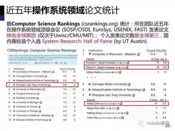 这个人就是上海交大的陈海波教授,虽然还是个年轻的80后教授,但陈海波教授在操作系统领域的突破太过耀眼了,用他自己的话说就是——截至2 0 1 0年底,亚洲学者40年来在S O S P(操作系统原理大会,成立于1967年)上独立发表研究论文的数目仍然为零,2011年陈教授的论文被SOSP接纳,实现了中国乃至亚洲的突破。