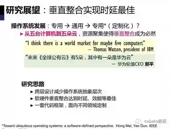 鸿蒙系统真的只是面向智能手机的?现在外界对华为的自研系统还是一头雾水,但是从陈海波教授的研究来看,华为的鸿蒙系统的野心没这么小,智能手机只是其中的一部分,从网络上找到的论文来看,华为要做的系统是“一套代码框架 面向不同领域定制”,软硬件垂直整合达到实验、效能等最佳,数据中心可用,PC、智能手机等消费级领域也能用。