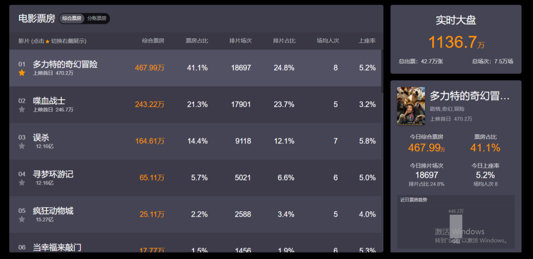 36氪获悉,猫眼专业版数据显示,在影院正式复工后的首个周五,全国单日票房首破千万。截至发稿,总出票量为42.7万张。日票房贡献最高的影片分别为昨日新上映的《多力特的奇幻冒险》、《喋血战士》以及复映片《误杀》。