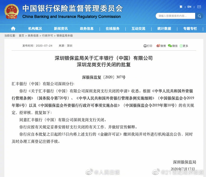深圳银保监局:同意汇丰银行深圳龙岗支行关闭