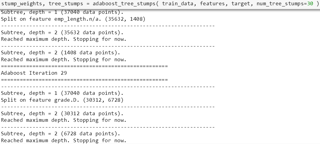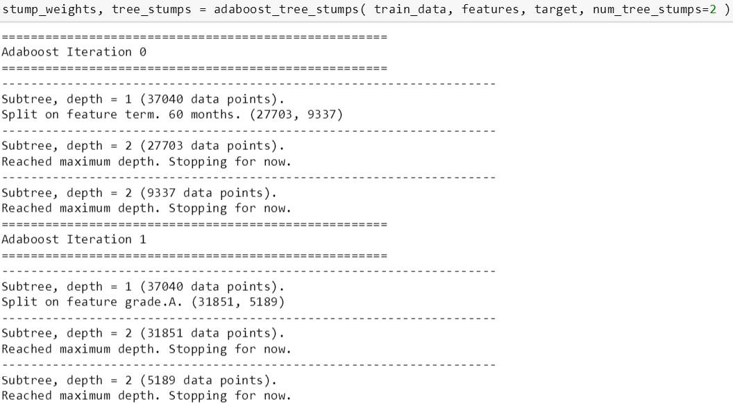 首先斯蒂文先从最简单的 2 个树桩开始,看看那些它们用到哪些特征来分裂树桩,同时也可以测试一下上面的代码是否运行正常。由下图可知,第一个树桩用 term.60 months 来分裂,而第二个树桩用 grade.A 来分裂。