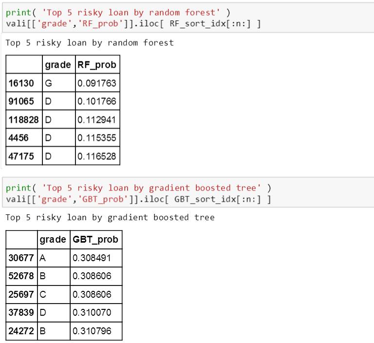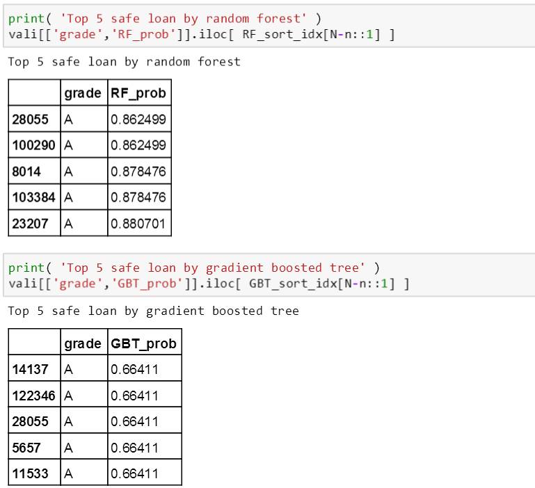 分别在随机森林和提升树模型下打印出最安全和最危险的 5 笔贷款的评级和概率,如下: