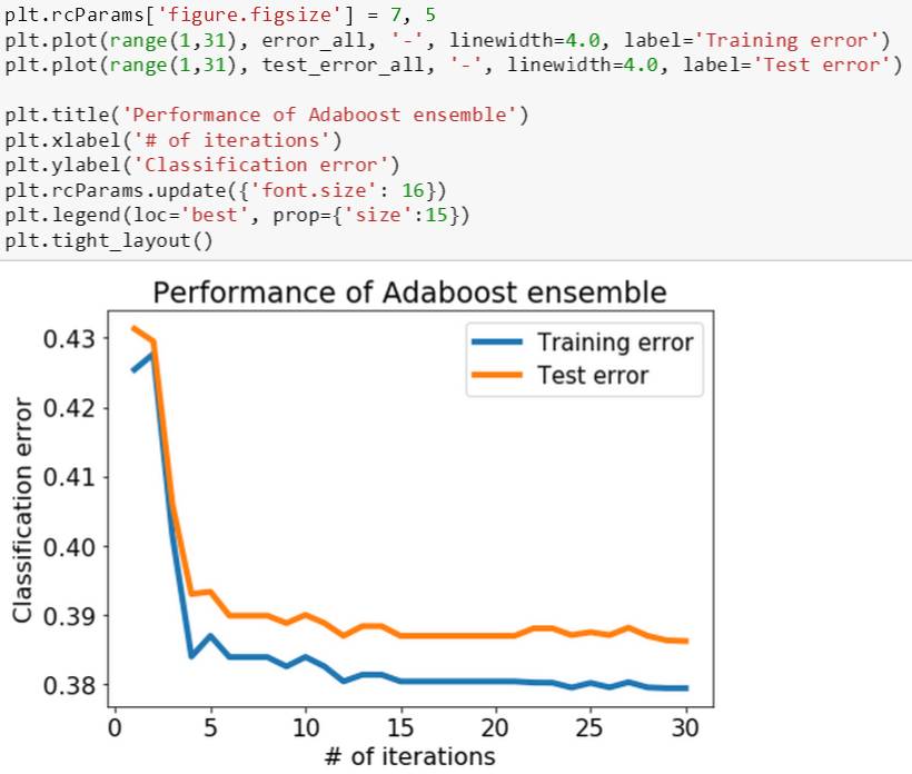 由下图可知,训练和测试误差的趋势很像,但是测试误差总是比训练误差略大一些,这也非常合理因为模型是在训练数据上做的。最重要的是,测试误差没有随着训练误差一直减小而在某点突然增大,因此这个 adaBoost 模型没有明显的过拟合。