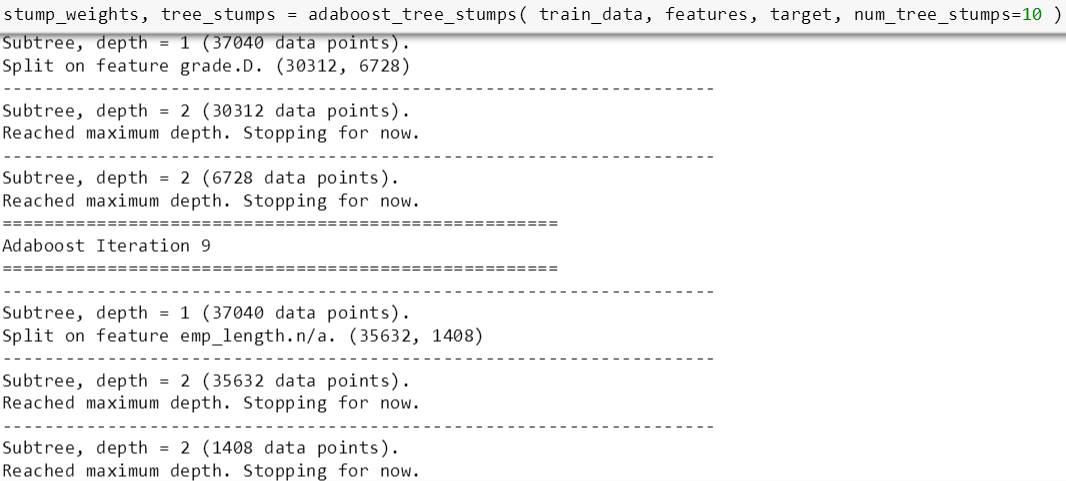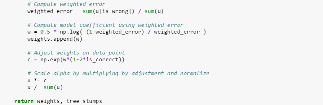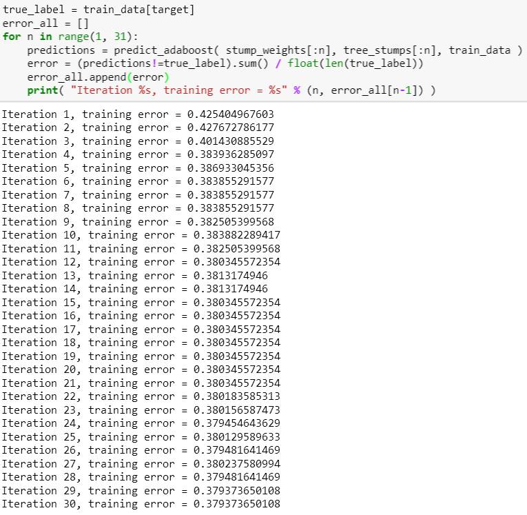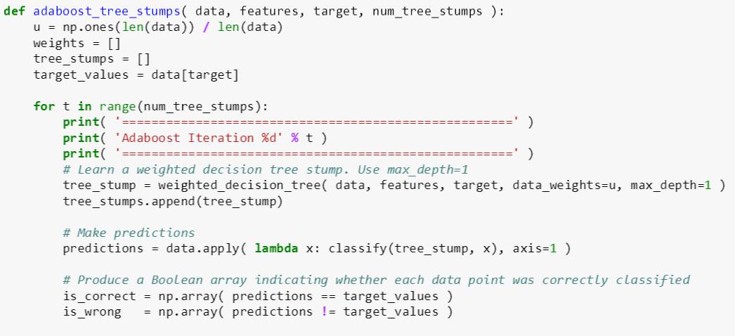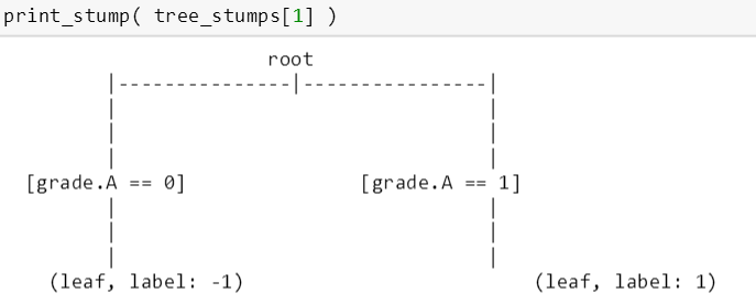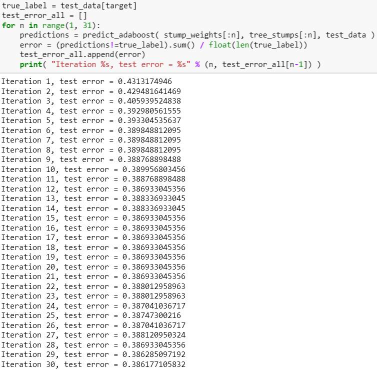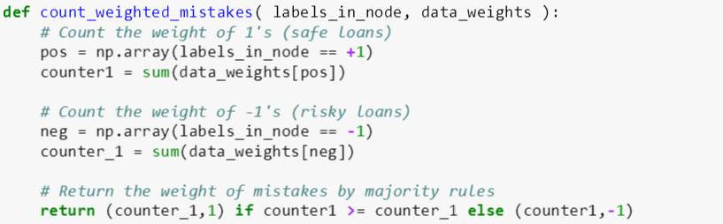 注意代码倒数第二行有个索引 [1],这是因为 count_weighted_mistakes 返回值有两个,第一个是权重总数,第二个是类,这里需要第二个返回值。同样本帖 create_leaf 是上贴写的延伸版,前者把 data_weights 里面的元素全部设为 1 就是后者。