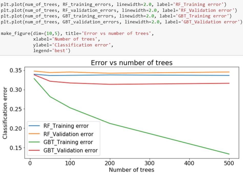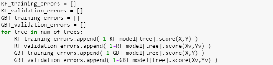 循环算出 RF 和 GBT 在每个子树集上的训练误差和验证误差,最后展示在一幅图里。