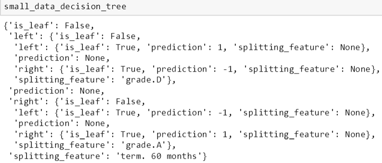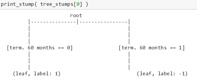 将这个树的结构打印出来得知,它首先在 term.60 months 做分裂,左子树在 grade.D 做分裂得到叶子,而右子树在 grade.A 做分裂得到叶子。