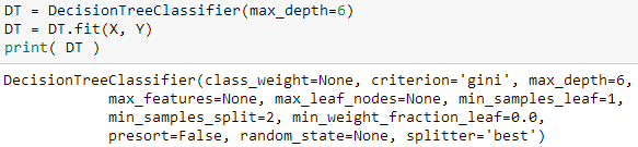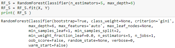 这两个模型都将树的个数 (n_estimators) 和最大树深 (max_depth) 分别设成 5 和 6。然后用 fit() 函数来拟合 X 和 Y 生成树模型。上面两个函数括号里的变量都可以赋予不同的值,斯蒂文此时就只想通过