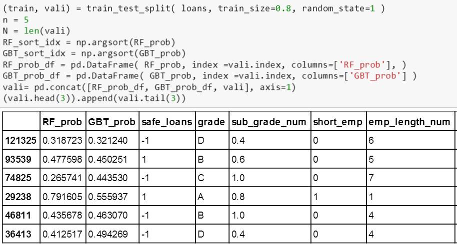 接下来,斯蒂文想看最安全和最危险的 5 笔贷款的评级,模型哪个指标能反映出安全或危险的程度呢?答案是 predict_proba 函数。