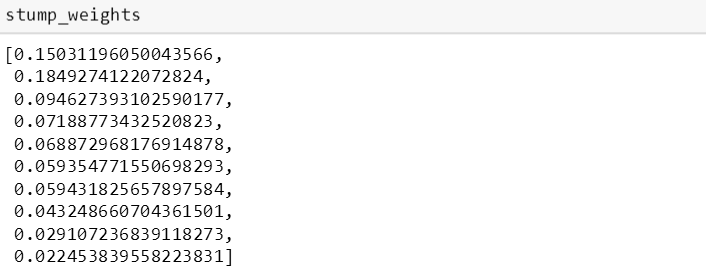 将 predict_adaboost 用到测试数据得到预测值,并和真实值比较算出测试准确率 0.61,并且打印出这 10 个树桩对应的权重,发现权重几乎是逐渐递减的。