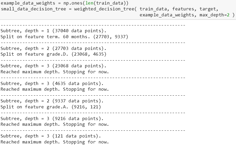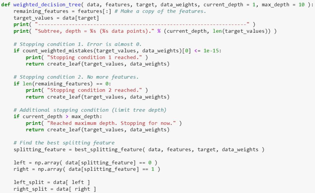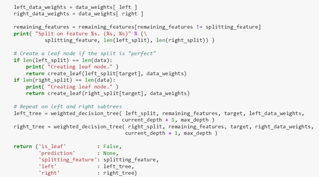 反之,用递推方法继续用 weighted_decision_tree 来创建子树,这时 current_depth 在原来基础上加 1