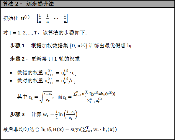 其代码逻辑参考随机森林和提升树一贴的 adaBoost 非常容易看懂。对照下图,adaboost_tree_stumps 主要完成了步骤 1 到 3 而最后得到了 num_tree_stumps 个树桩和对应的权重 (注意这里的权重是每个树桩配给的权重,不要和上面数据的权重弄混淆)。
