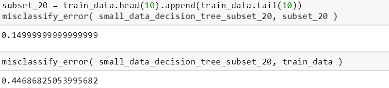 下面看看这棵权重树在 subset_20 (权重放 1) 的训练误差,只有 0.15,但是该树在整个训练集上的误差高达 0.4468。