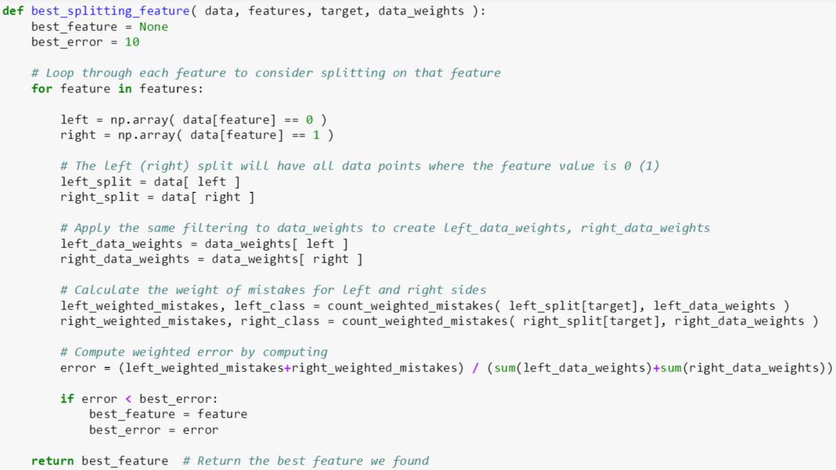 本帖 best_splitting_feature 是上贴写的延伸版,后者计算误分类率而前者计算权重样误分类率,前者把 data_weights 里面的元素全部设为 1 就是后者。