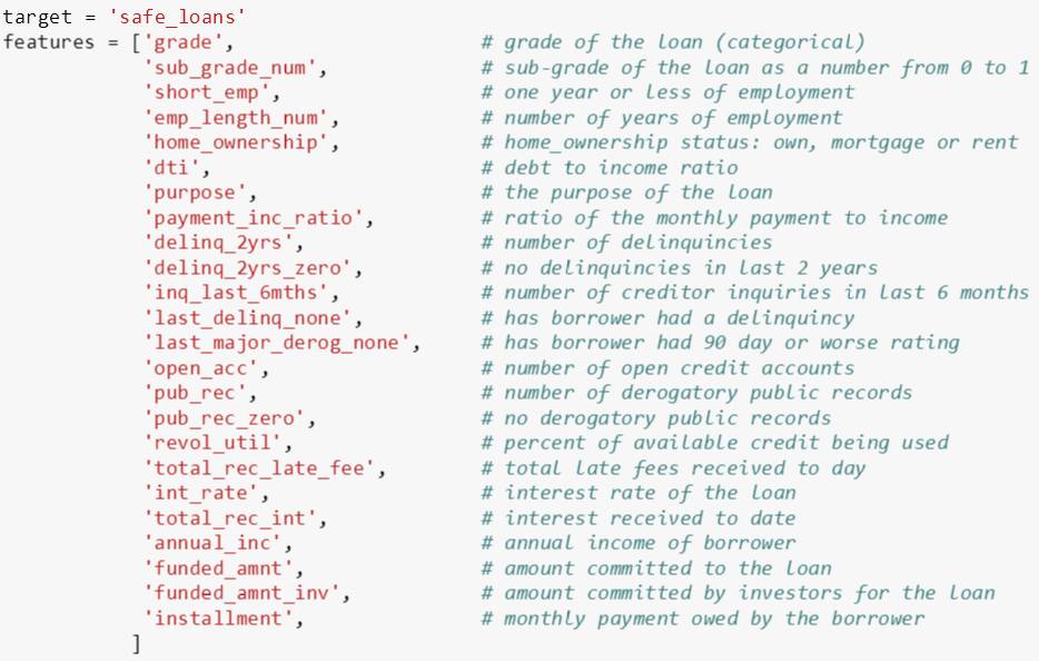 在用 sklearn 自带模型中,我们选取以下 24 个特征 (原来有 67 个特征),包括评级、子评级、工作年数、房屋所有权、负债收入比、贷款目的、违约次数、贷款利率、年收入、月供等等。