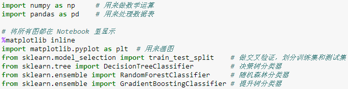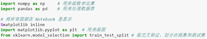 本章还是需要用到 numpy, pandas, matplotlib 和 sklearn 这四个工具包。 此外还需用到 sklearn 里model_selection 里的 train_test_split 用来划分训练和测试集。