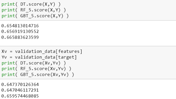 接下来看看这三棵树在训练数据和验证数据上的表现,即检查训练误差和验证误差 (直接用 score 函数来检查准确率,误差 = 1 - 准确率):