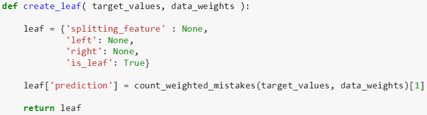 利用 count_weighted_mistakes ,赋值 leaf 的预测为 1 (正例权重总数大于反例权重总数),-1 (反例权重总数大于正例权重总数)