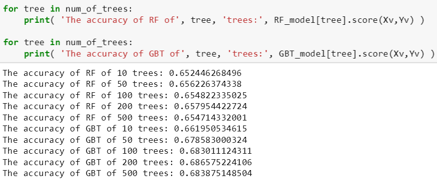 之后用 score() 计算每个子模型的验证准确率,斯蒂文发现其准确率也不是随树的棵数增加而增加的,比如 RF 和 GBT 都是在 100 棵数时验证准确率最大,到 500 棵数时验证准确率反而还会降低。