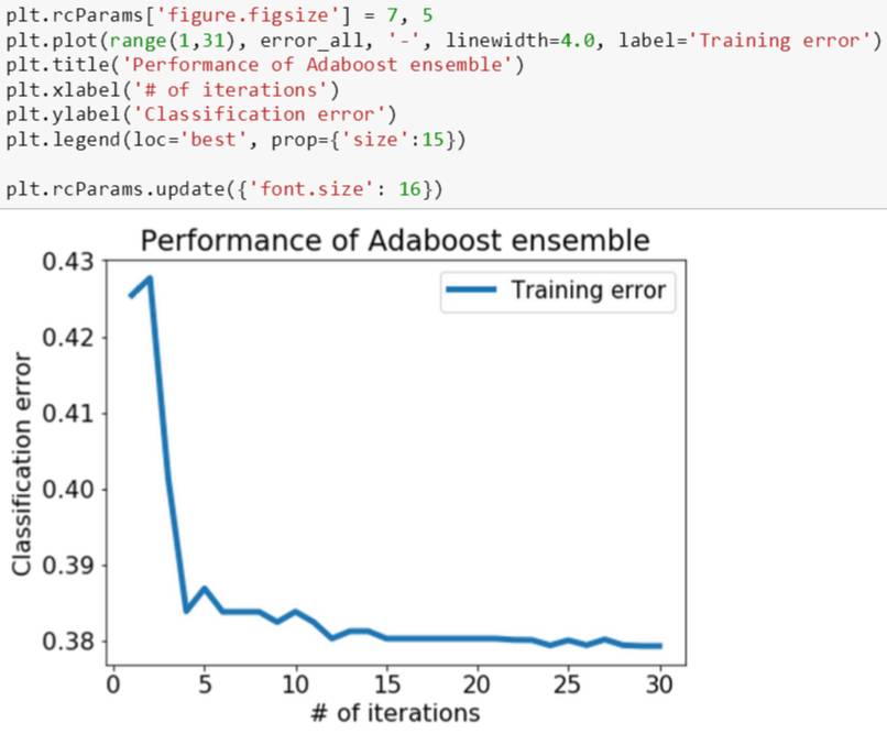 由下图看出,训练误差随着树桩数增加而减少,在前 5 个树桩尤为明显,后面减少的幅度低了很多,因此在本例选择树桩数时,根本没必要选到 30 这么多,具体多少个要看你对误和计算时间的容忍度而权衡决定。