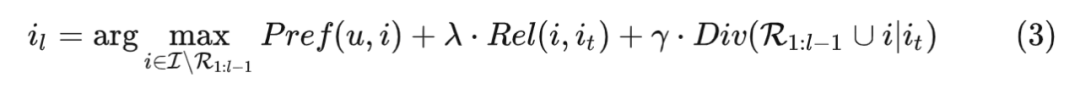 中挑选一个没有被选取的 item,让这个 item 的用户偏好得分、与 trigger 的相关性得分以及加入到已选择集合后的多样性得分加权分值最大化。至于具体的