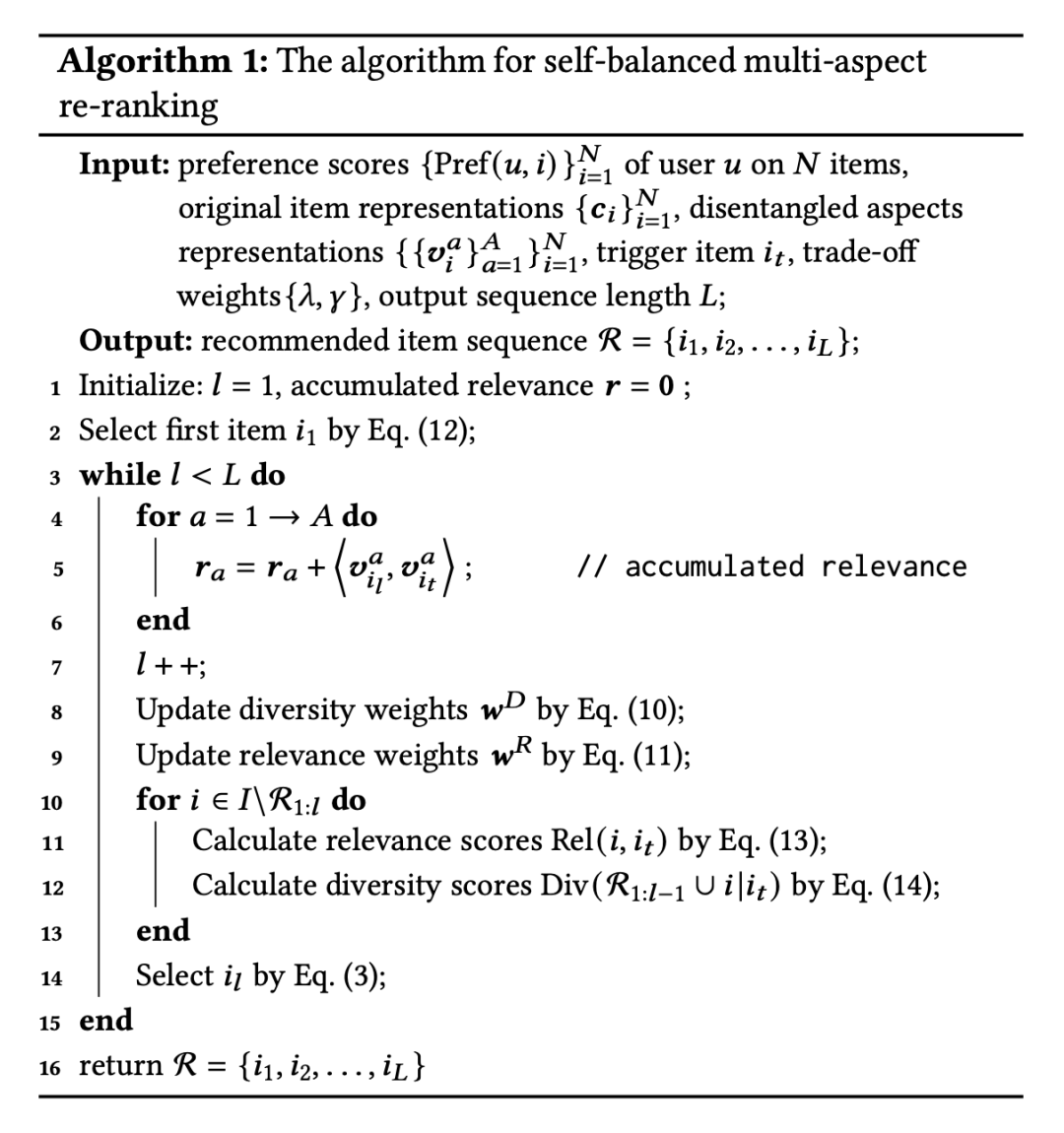 我们来看下自平衡多元重排器是如何生成最终的结果的,这里采用了贪心的选择过程,在第 1 个选择 step,因为当前的已选择集合中还没有任何 item,因此当前 step 退化为单个 item 的相关性得分,计算方式如公式 (9):