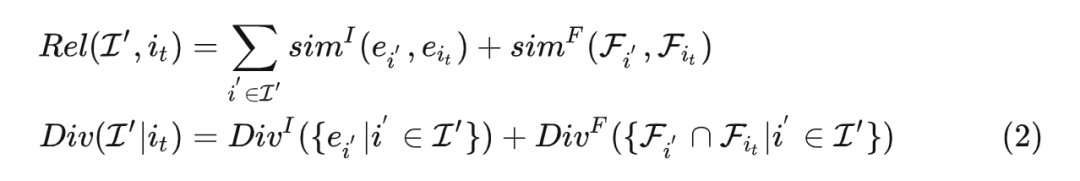 从公式 (2) 来看,这里提出的方法相对于已有的相关性和多样性方法,主要的区别和创新在于除了 item 维度之外,引入特征维度,例如品牌、颜色等 side information 信息进行相关性和多样性的计算。也就是公式 (2) 中的